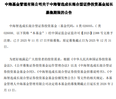 中国经济网北京11月21日电 今天,中国海外基金管理有限公司发布关于延长中国海外精明成长混合型证券投资基金募集期限的公告。公告称,中海智选成长混合型证券投资基金(基金代码:A类026005、C类026006)已获中国证监会2026年2025年第13号核准注册。该基金现任管理人姚伟曾任凯基证券(原台湾证券)上海代表处分析师、光大证券国际股份有限公司分析师、交银国际(上海)股权投资管理有限公司、兴业证券海外资产管理有限公司高级分析师2017年10月加入,现任投资研究中心高级分析师、基金经理。