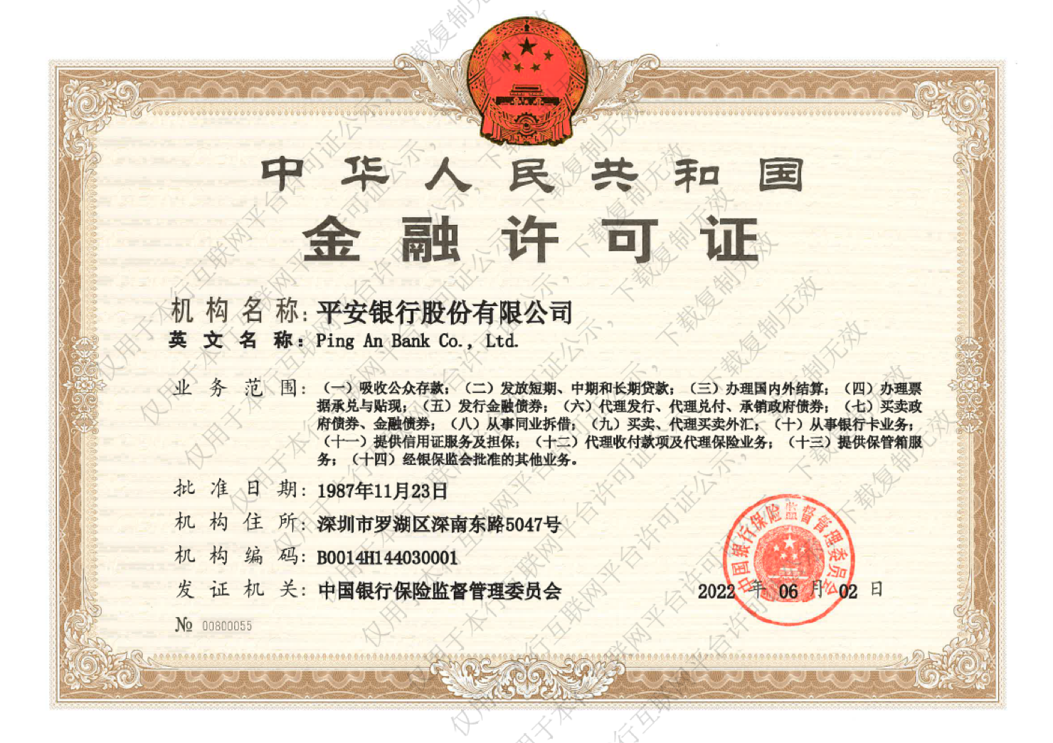 根据“银行和保险机构许可管理”的相关规定,该机构的财务许可证和相关信息今天宣布如下: